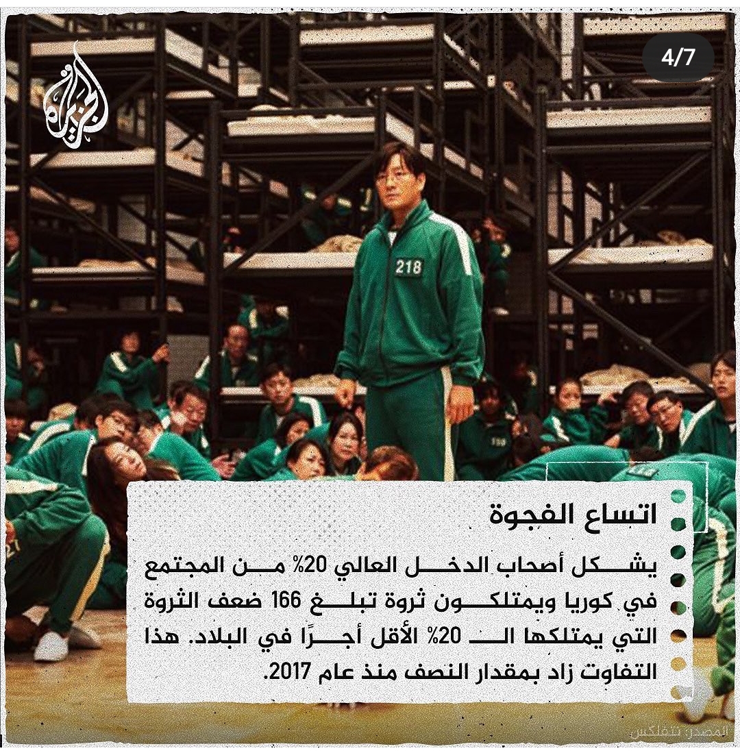 『오징어 게임』은 한국뿐만 아니라 전세계적으로 인기를 끌고 있고, 아랍권도 예외가 아니다. 심지어 한국에서도 유명한 아랍권 매체인 알자지라에서도 『오징어 게임』을 다룰 정도다. 우연히 인스타그램 알자지라 페이지에서 『오징어 게임』을 통해 바라본 한국 사회를 분석한 짧은 글이 있기에 아랍권 언론이 『오징어 게임』과 한국 사회를 어떻게 바라보는지 간략하게나마 소개하고자 여기에 옮겨 본다.